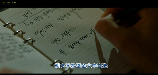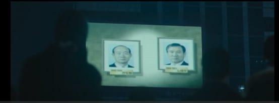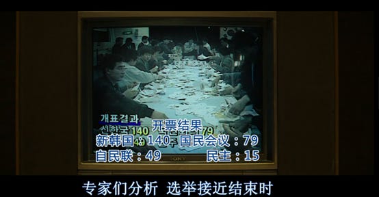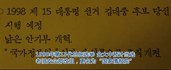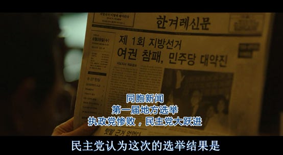 与此同时,除了当前进行的核武器探查计划之外,电影中的第二条线也逐渐铺开。“从黑金星”看到的报纸中(下图)可以得知,韩国执政党的地方选举惨败于在野党,也就是民主党(全名为新千年民主党)。新千年民主党的党魁就是韩国未来的总统金大中。当前韩国政治局势的扑朔迷离推动着剧情中第二条线的发展。