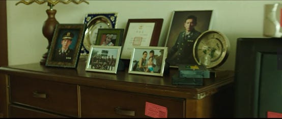 在1992年这种背景之下,朝鲜是否拥有核武器直接关系到韩国的国家安全,而朝鲜又不愿意接受国际机构的调查,所以为了应付半岛核危机,韩国和美国召开会议宣布对朝鲜采取强硬措施,同时韩国安企部决定对朝鲜派出特工,来秘密探查朝鲜核武器的情况。本片的主人公朴皙映就这样从韩国军队司令部里被安企部招募成为一名特工,在后面执行任务时,代号为“黑金星”。为了洗刷过去的经历,抹去军人形象,培养商人气质,同时瞒住那些渗入到韩国的朝鲜间谍之眼,朴皙映通过赌博,酗酒,借钱等一系列操作在旧同事以及好友面前伪装自己。在下图的画面中,我们可以看到朴少校从前作为军人的英武气质还有取得的种种荣誉,此外一副似乎是家庭合照的相框表明他已婚并且有一子女,不过作为特工,这一切都得放弃。