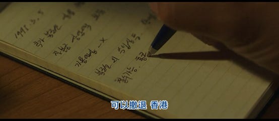 话题继续回到电影上,“黑金星”决定利用清源久引蛇出洞,来接近李明云处长。一开始清源久希望黑金星采购朝鲜产的玩具枪和辛德山矿泉水,但是黑金星认为这些产品利润太低,根本赚不到钱,假装非常生气,希望能做大买卖,比如香烟和汽车,这就让清源久认为“黑金星”是一名能给朝鲜赚到大量的外汇的商人,于是打电话给“朝鲜对外经济委员会”的李明云处长汇报“黑金星”的情况(见下图)。