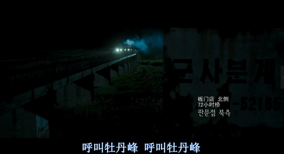 镜头画面转到了朝韩边界地区(下图),牡丹峰是平壤的一个区域,这里是向位于朝鲜的军方总部呼叫的代号。板门店距开城8公里,开城是位于朝韩边界的一个城市,朝鲜战争之前属于韩国方面控制,在朝鲜战争之后纳入朝鲜版图。开城盛产人参,又称之为高丽参。